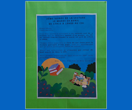 2ème nuit de la lecture au CDI le mardi 14 avril 2026 de 17h15 à 19h.